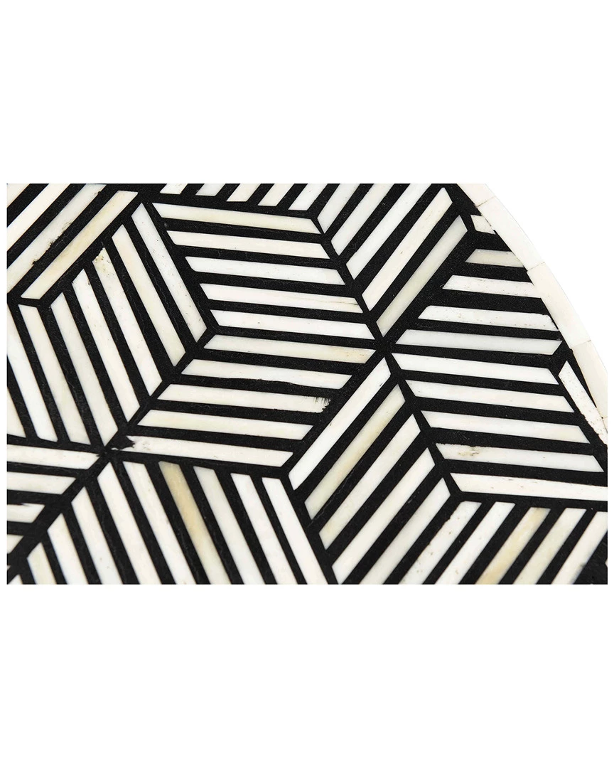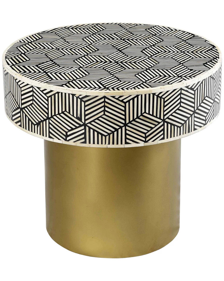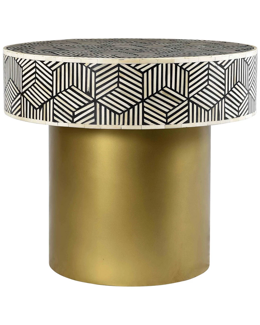 - Design details: A gorgeous, geometric design is formed from meticulously inlaid hand-carved bone and complemented with a matte brass pedestal base. Available in cocktail and side table sizes, it’ll stand out by itself or as a set; Handmade by master furniture artisans – Slight variations are to be expected; Stunning bone-inlaid design; Brass pedestal base; Genuine bone inlay; Available in two sizes