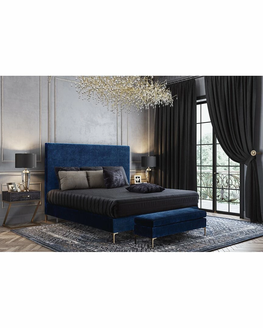 - The dramatic Delilah is quickly becoming a new fave. Inspired by modern design, the Delilah is clean and cultured with gold glamorous legs that pop against the textured navy velvet upholstery. Available in full, queen and king sizes. Finish off the look with the matching Delilah bench and take the guess-work out of decorating!