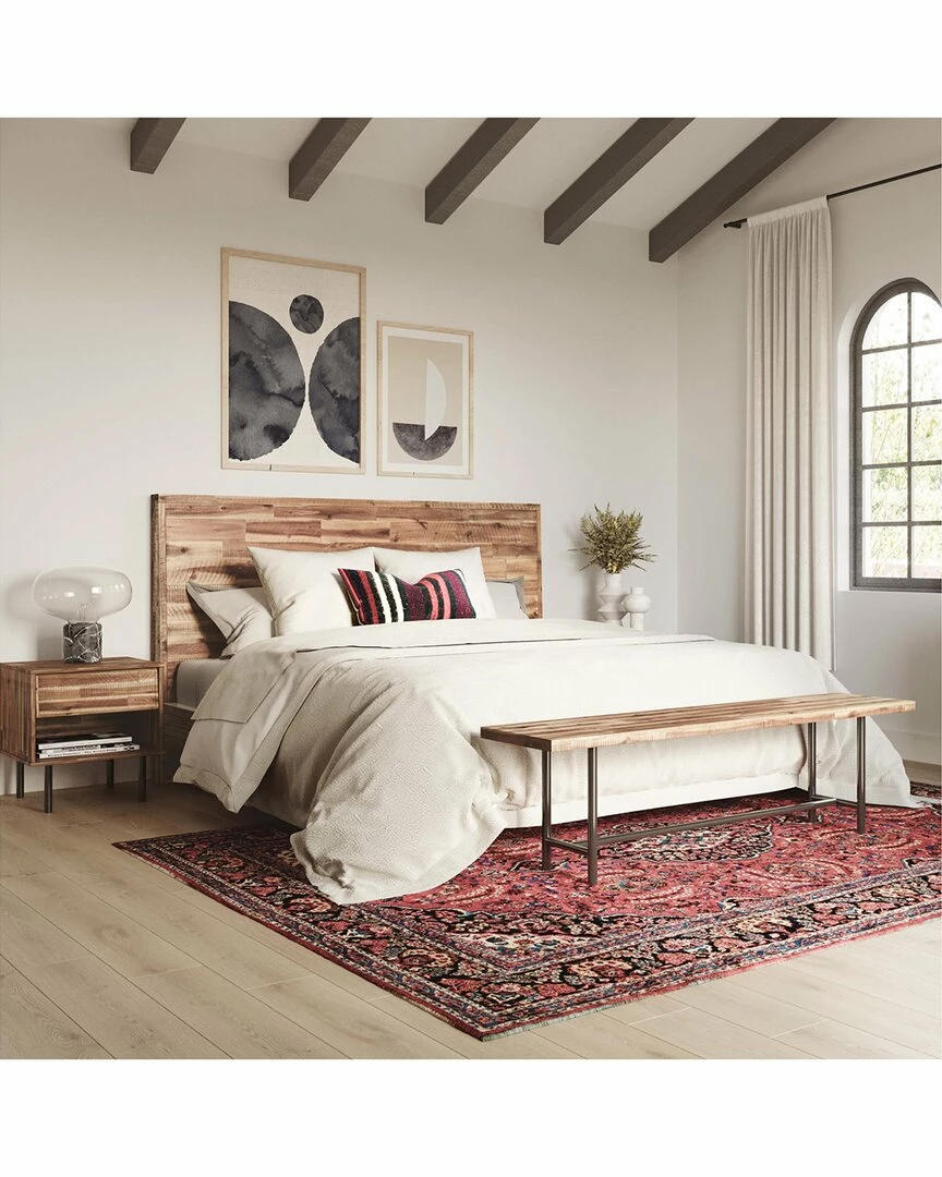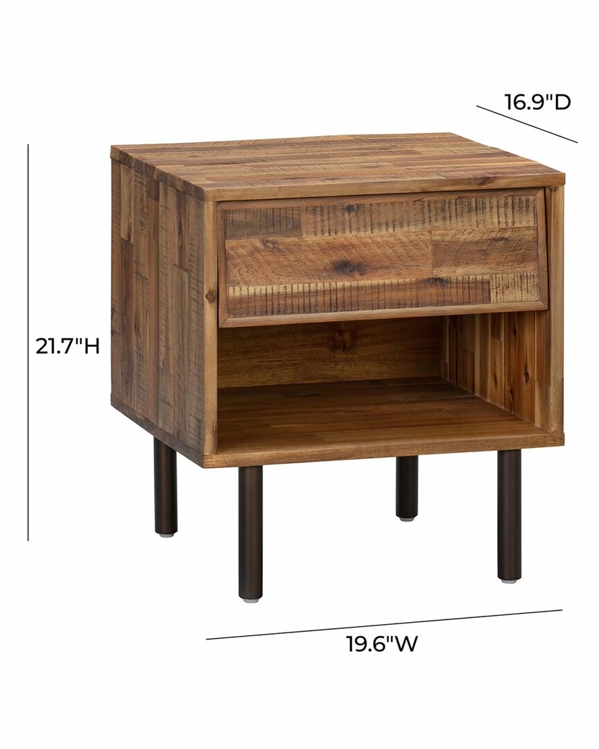 - The Bushwick collection is that rustic getaway that you have been dreaming of. Crafted from 100% Acacia wood it offers style and durability all wrapped into a stunning nightstand. Each piece is truly one of a kind made with naturally colored wood to create a unique pattern just for you, while the brass metal legs add a perfect contrast to the hues of the frame.