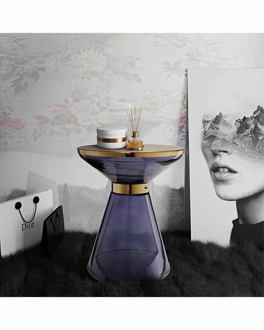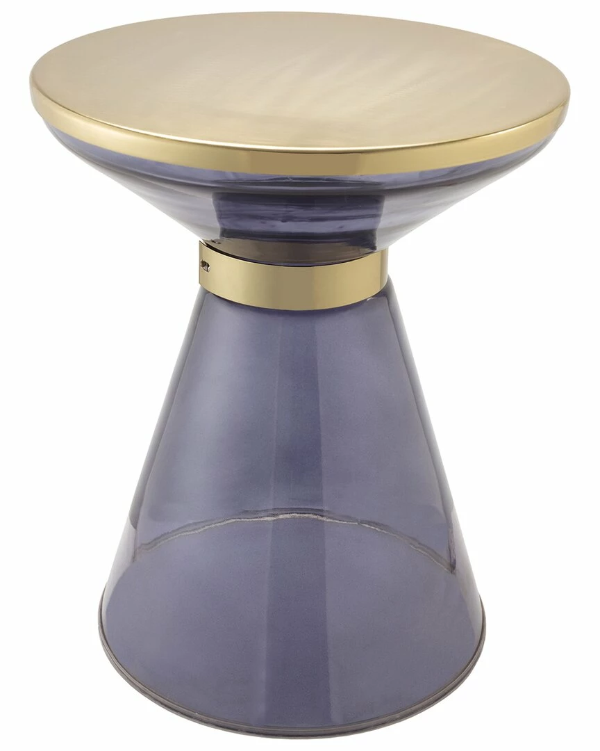 - Infinitely glam, the Coral table is the perfect balance of sleek and chic. Its hourglass shape, gold top and blue glass body make this unique side table a true crowd pleaser. With no assembly required, this table is ready to enhance any space.