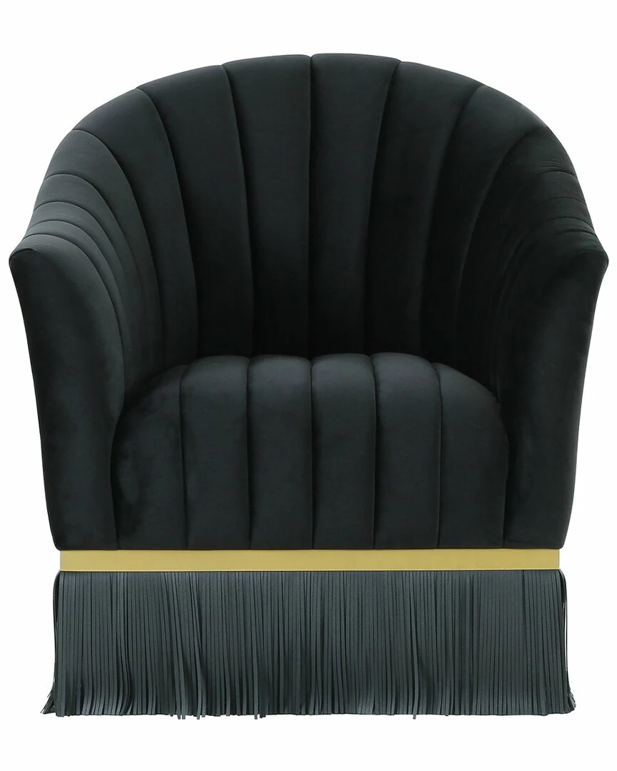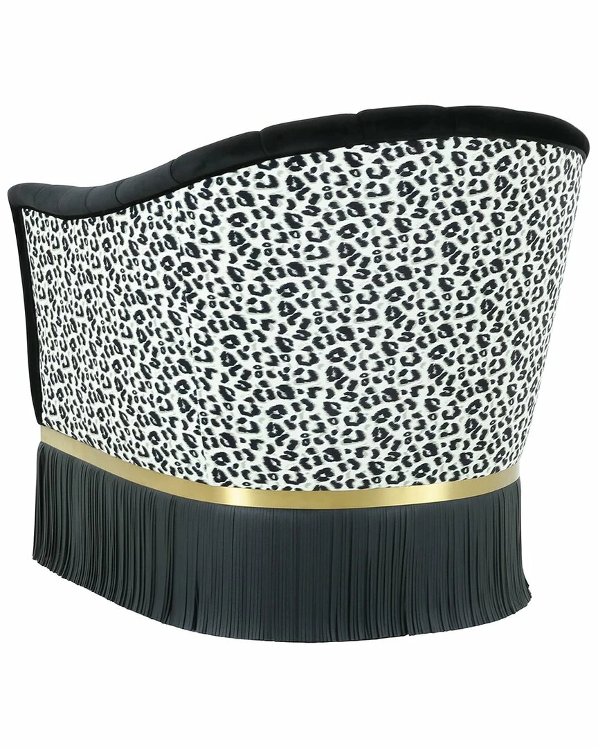 - Add a dash of pizzazz and excitement to your space with the Enid Chair. Upholstered in sumptuous velvet while boasting a leopard print on the outer body, this chair is like no other. The fringe-lined gold base adds a flare of coolness to this comfortable chair.