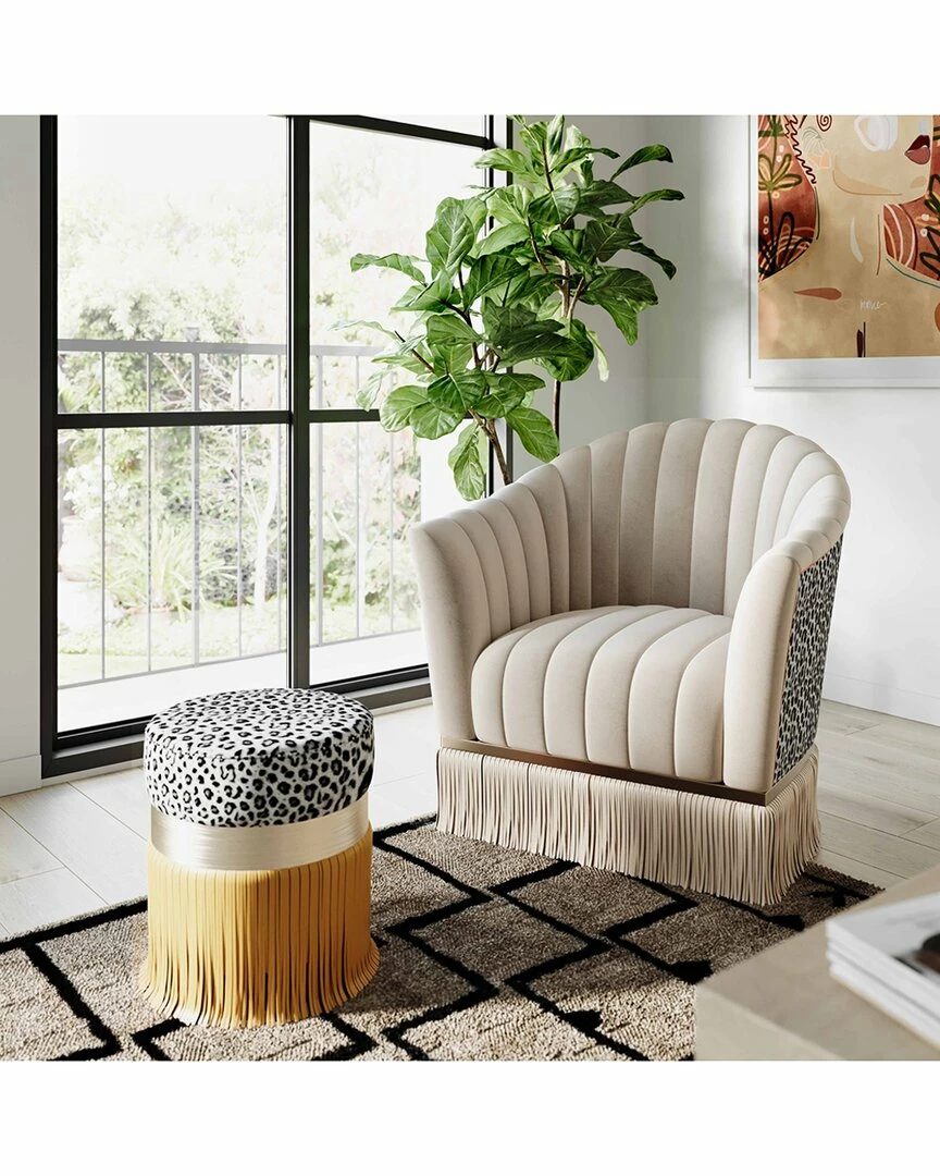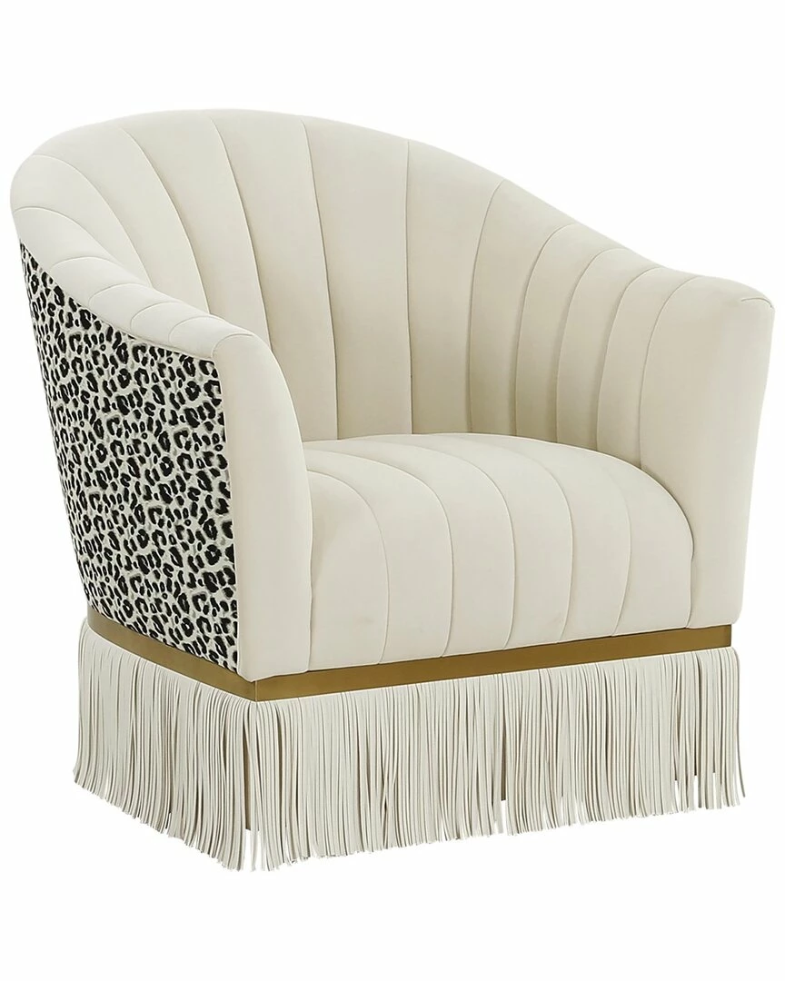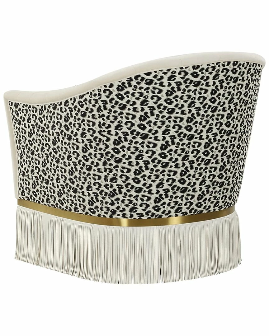 - Add a dash of pizzazz and excitement to your space with the Enid Chair. Upholstered in sumptuous velvet while boasting a leopard print on the outer body, this chair is like no other. The fringe-lined gold base adds a flare of coolness to this comfortable chair.
