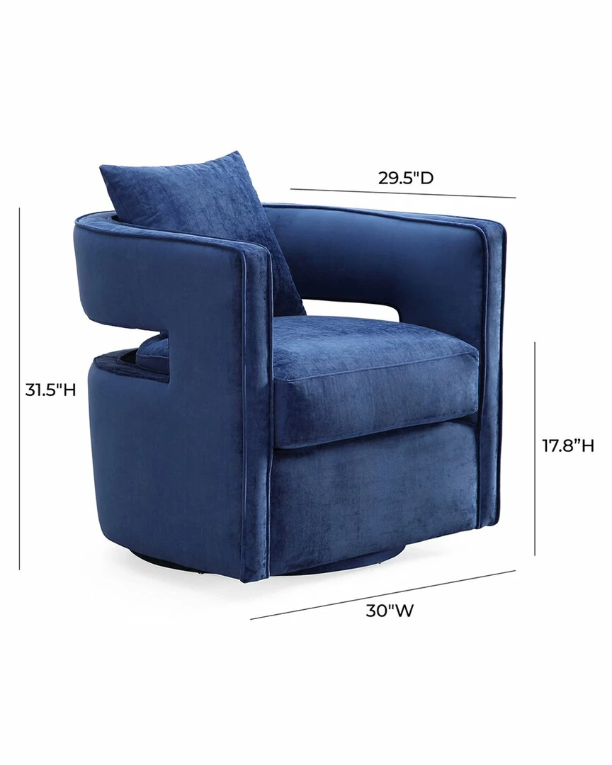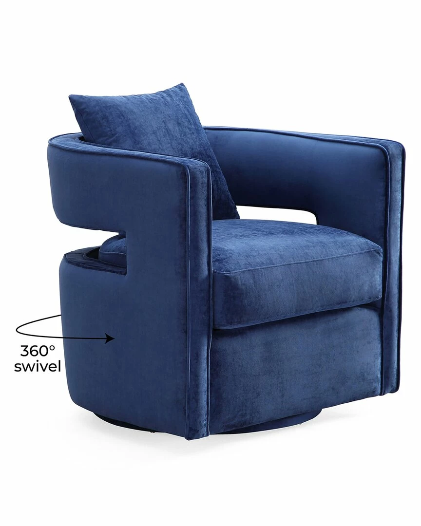 - The minimalistic Kennedy swivel chair is versatile and stylish. A comfortable foam fill makes it as plush and inviting as it looks, while the solid wood frame and stainless steel legs set a sturdy foundation. This eye-catching chair will add a pop of style to any space. Available in several sumptuous velvet color options.