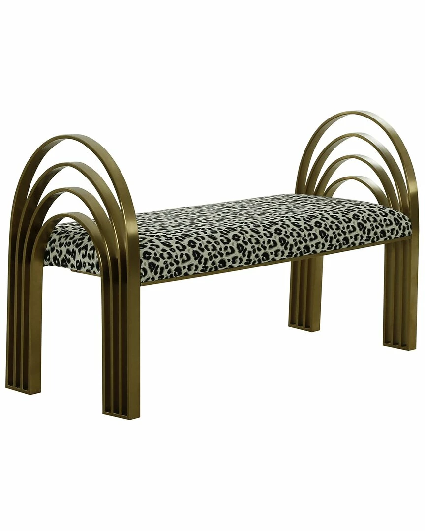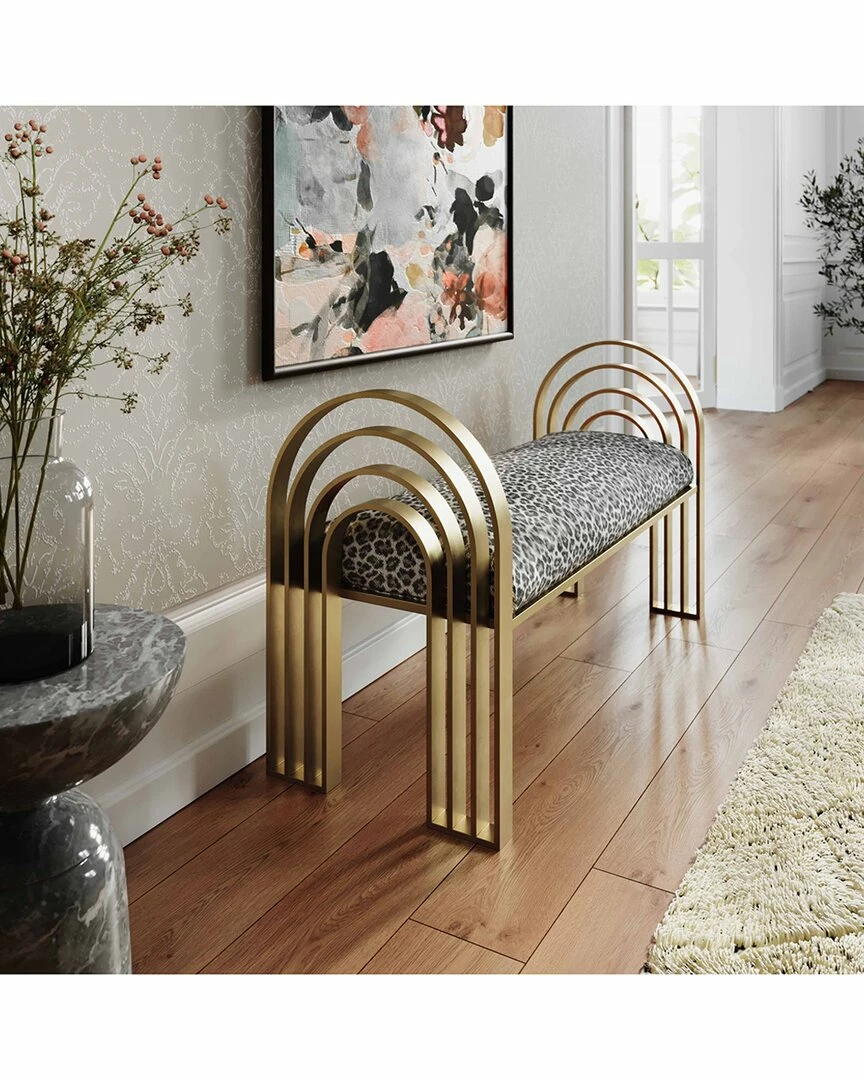 - With its unique style, color, and silhouette, the Mavis bench embodies both luxury and fun. The art deco-inspired gold frame, combined with stylish velvet fabric, this piece is the perfect accent piece for your hallway, living room, or bedroom!