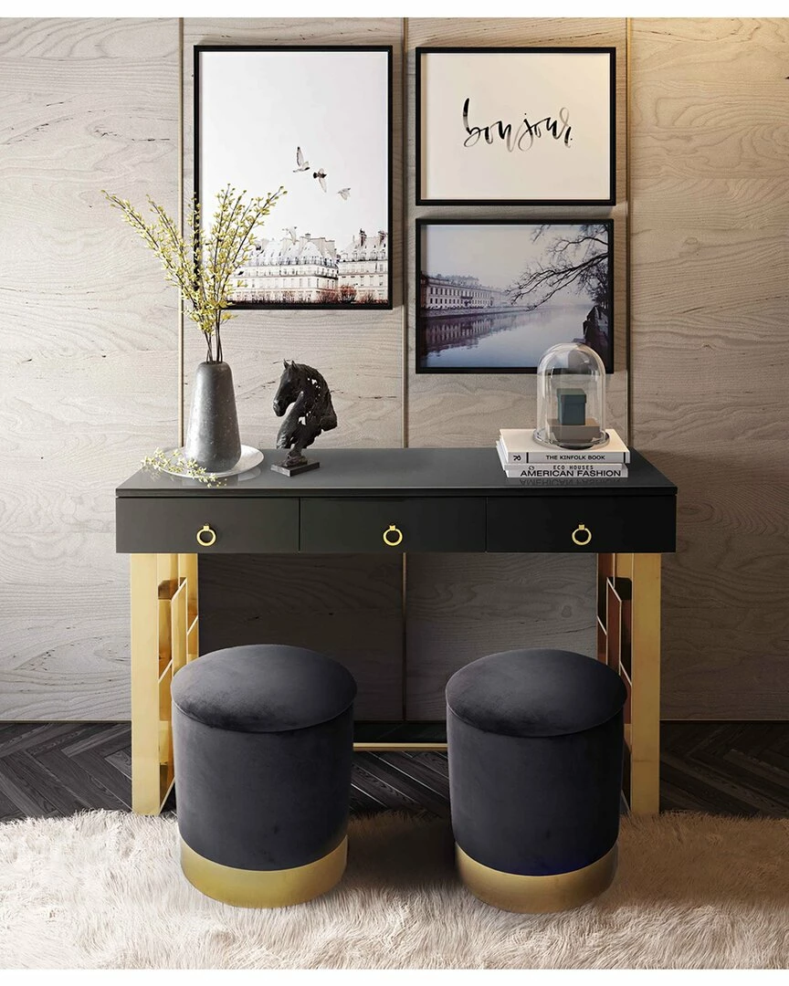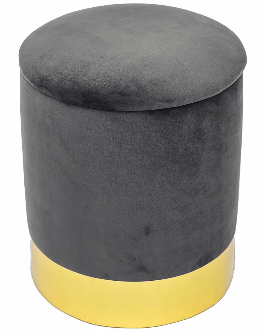 - Comfort and charisma are not the only features you’ll love about this ottoman; this upholstered beauty has ample storage space as well! Upholstered in lush velvet and perched upon a gold base, this multi-use ottoman is sure to add a pop of color your space.