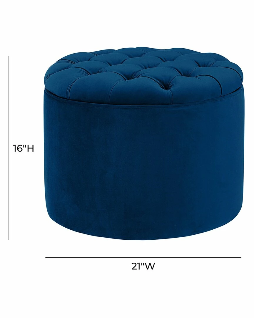 - Make storage glam. Beauty is taken to new heights with the Queen storage ottoman. Whether you use it as a foot stool or side table the elegant tufting and rich velvet will make you feel like a royal. So put your things away and look stylish while doing it. Available in multiple sumptuous velvet color options.