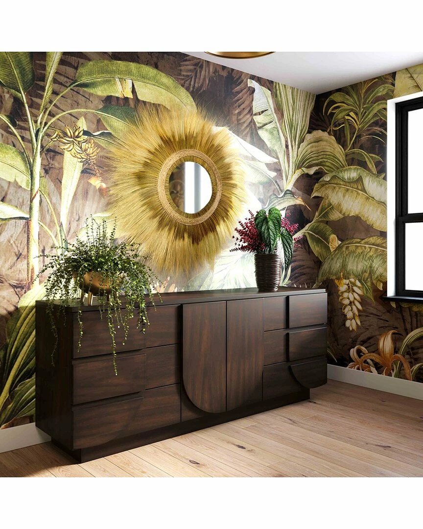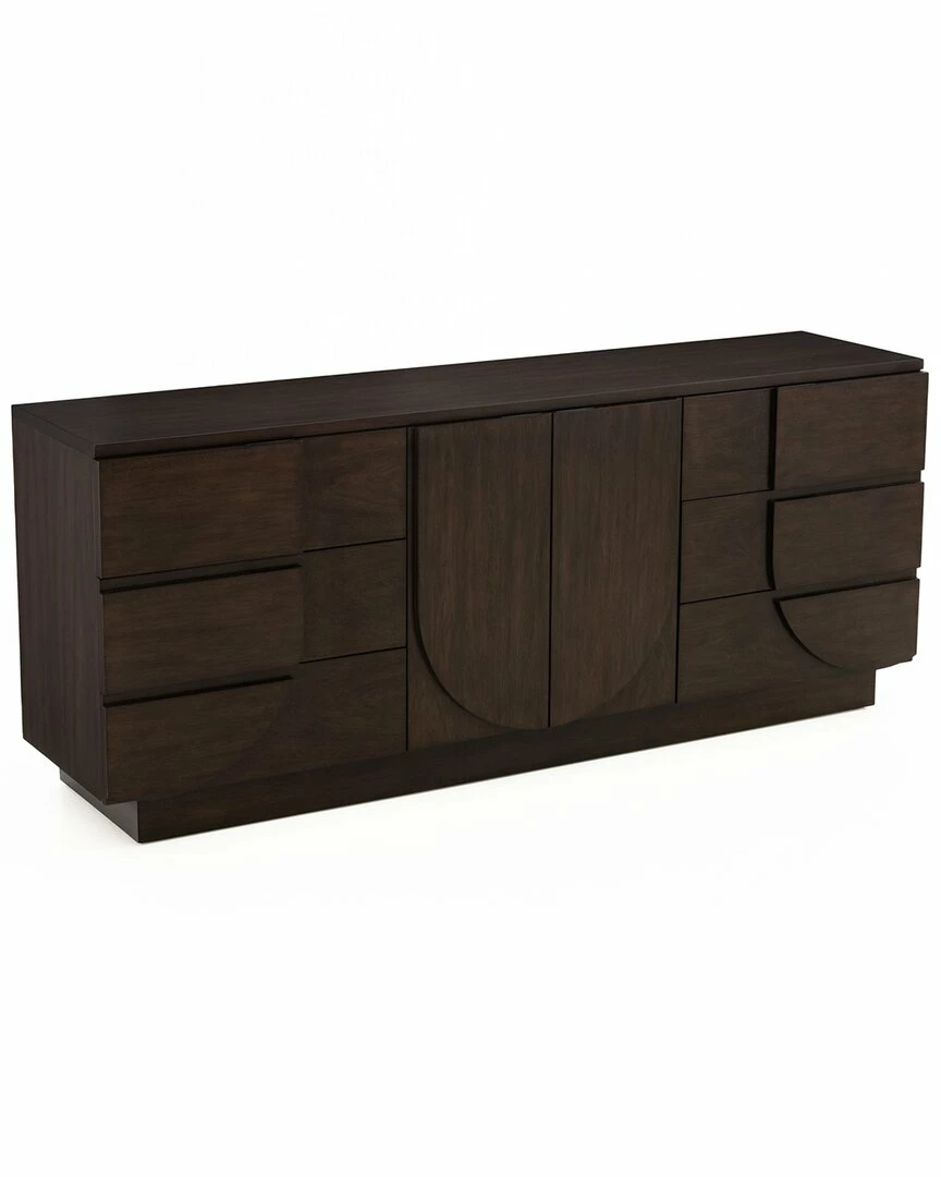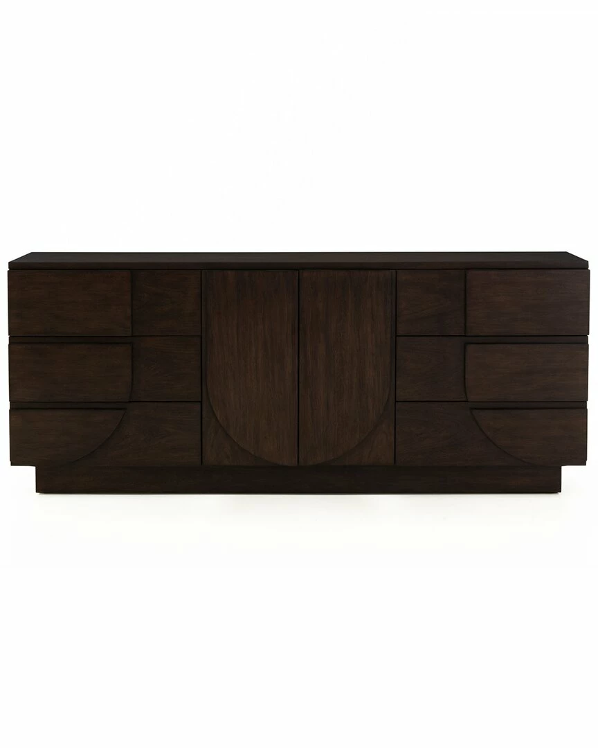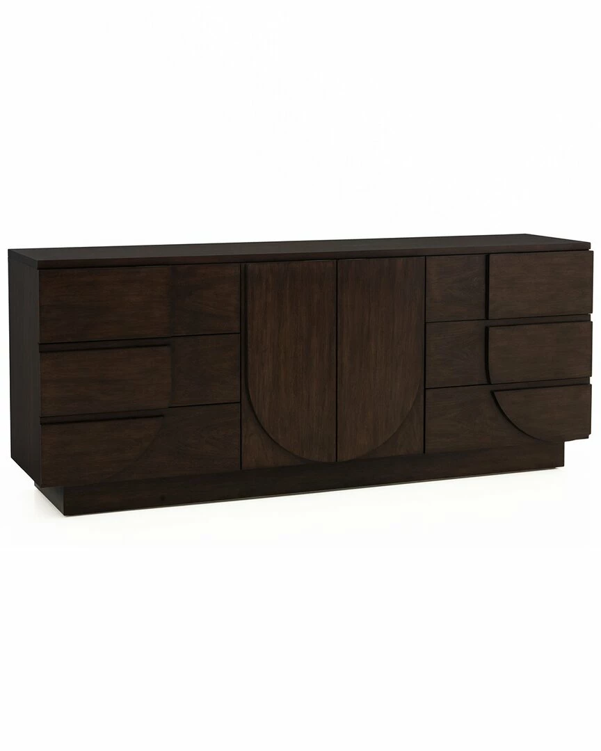 - Truly a decorous addition to your living room, the Simone Credenza is refined and reliable. Acacia wood construction ensures durability while soft-close drawers offer convenience and ample storage space.