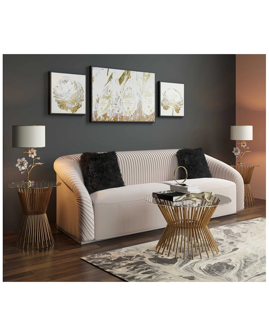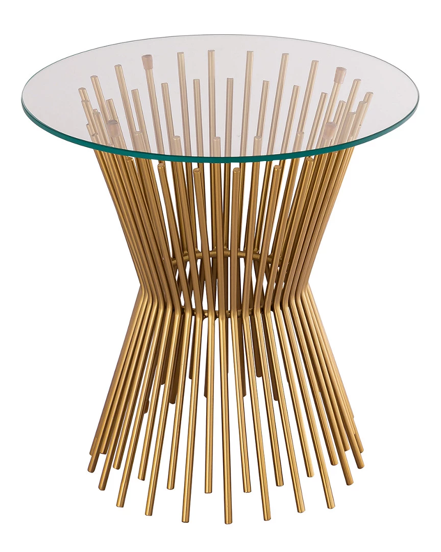 - Design details: Enhance your home with this stylish Grace table from Inspire Me! Home Decor and TOV. A clear glass top sits on an hourglass pedestal base, furnished from individual iron spokes finished in satin gold. Available in coffee and side table sizes, this table will stand out alone or as a set