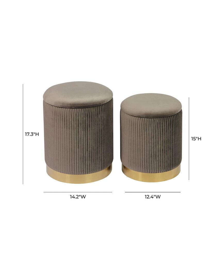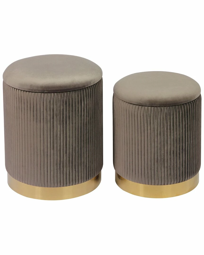 - Perfect for small spaces this pleated round ottoman offers both, stunning design and ample storage space. Available in two neutral colors, it’s upholstered in soft velvet and complemented with a brushed gold base. Set includes two ottomans.