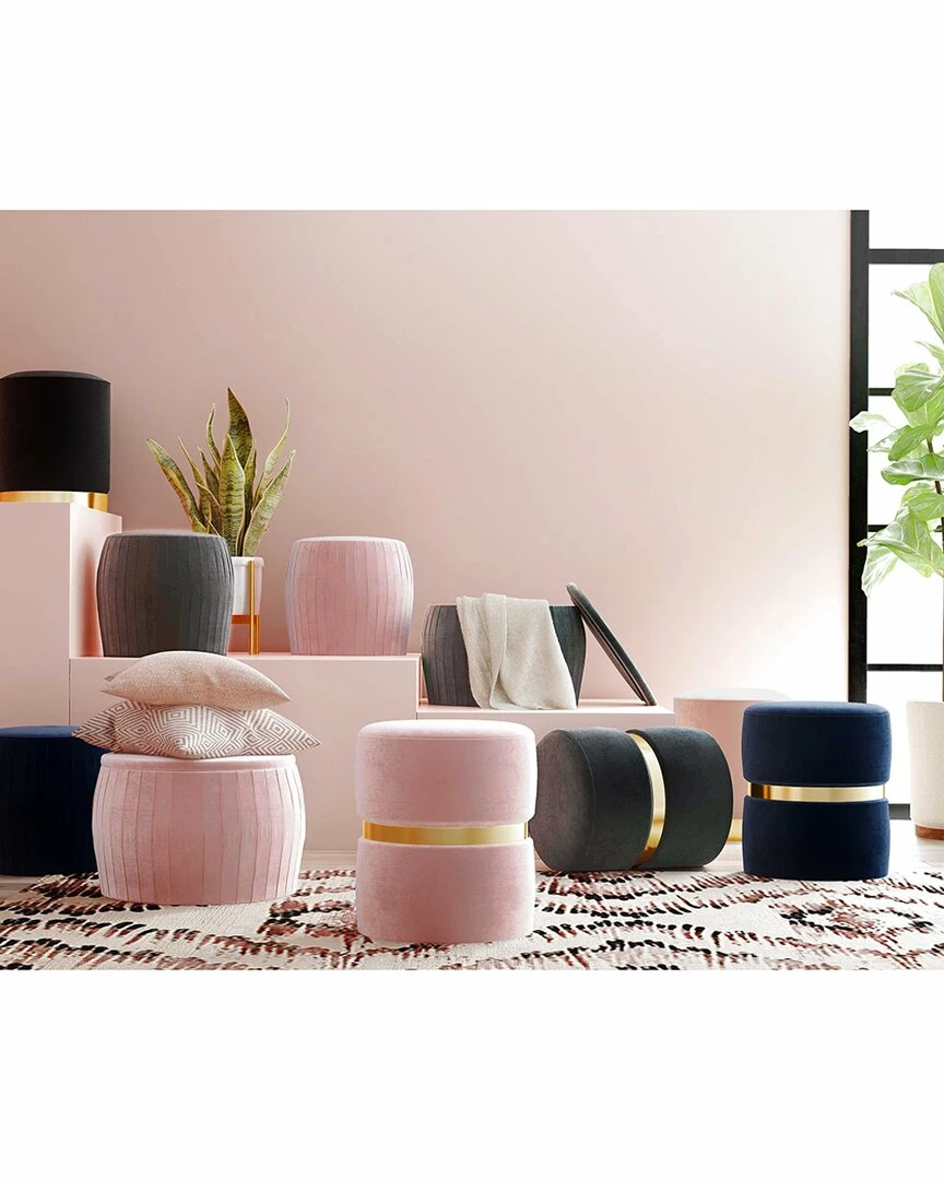 - Cute and petite, the Yamma ottoman offers a burst of color and glam design. Featuring soft velvet upholstery punctuated by a contrasting gold band, this versatile ottoman can be used as a footstool or an extra seat.